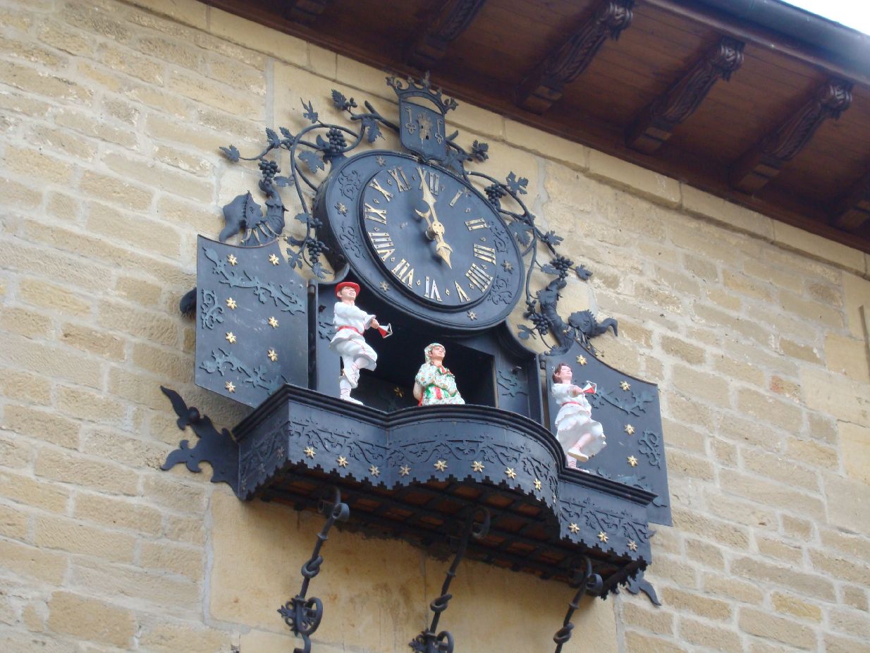 puede verse el escudo de la villa ( una torre y dos llaves) y un reloj carillón