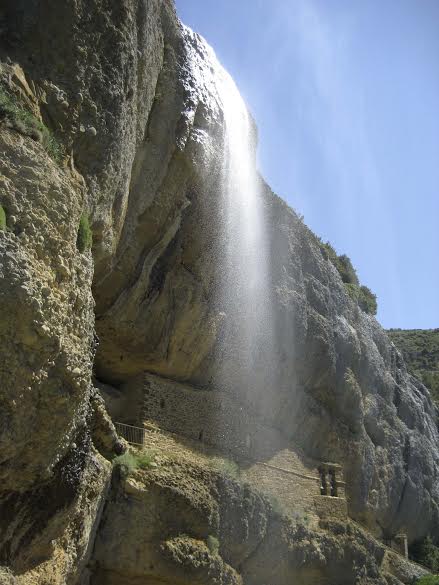 la base de rocas donde se alojan las de ermitas y la cascada que, a modo de