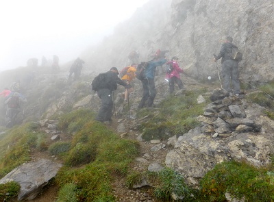 española. En un tramo resbaladizo un cable de acero nos facilita el paso y a