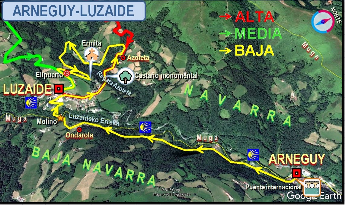 -Un tramo del Camino de Santiago, desde Arnegui hasta Valcarlos, para añadir algún km, saliendo de la frontera francesa por donde unos frontones, y que recorreremos por firme asfaltado hasta el puente peatonal del antiguo molino ya en Valcarlos.