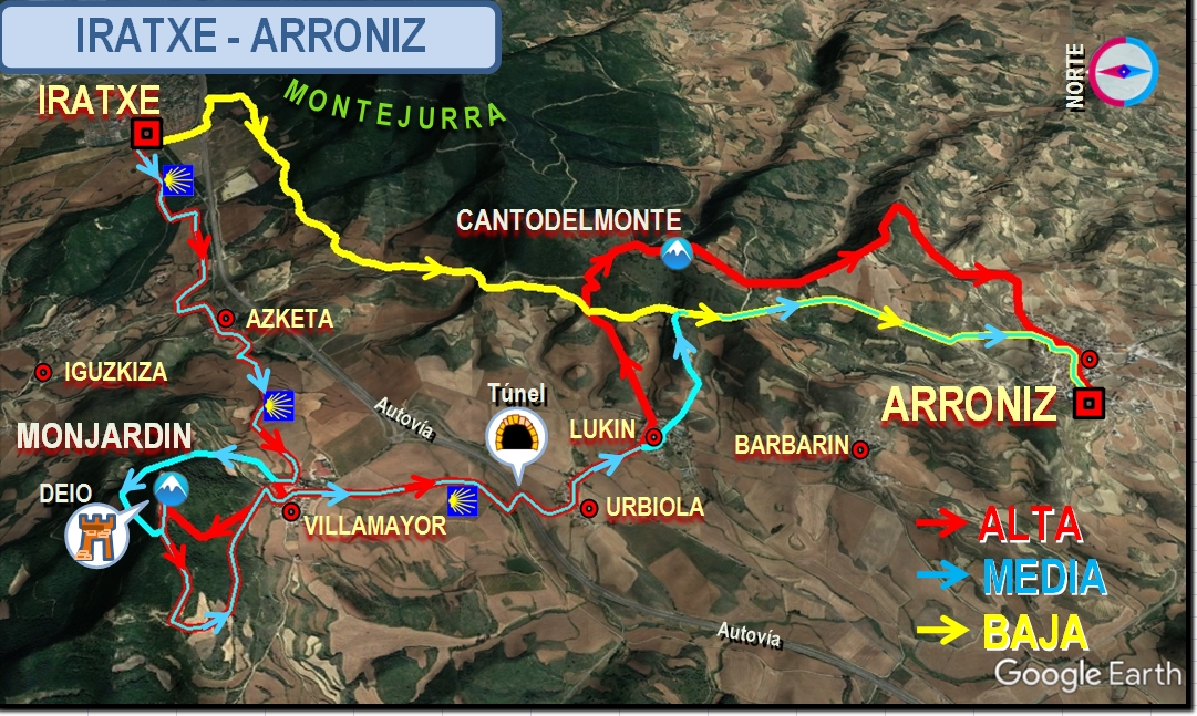 Tras pasar una línea de viviendas unifamiliares cogemos una pista y enseguida cogemos una senda que nos conduce hasta el castillo de Monjardin, en el cual se encuentra la ermita de la Cruz (es el mirador de Navarra de donde más pueblos se divisan, más de 60). Tras dar un paseo por su interior y contemplar las espectaculares vistas iniciamos el descenso. Por pista hasta el camino de Santiago en Villamayor, después de recorrer un kilómetro por él, giramos a la izquierda para cruzar la autovía por un túnel, pasamos por Urbiola y en Luquin cogemos una pista, primero de tierra y luego de cemento, hasta un cruce con la indicación de Montejurra.