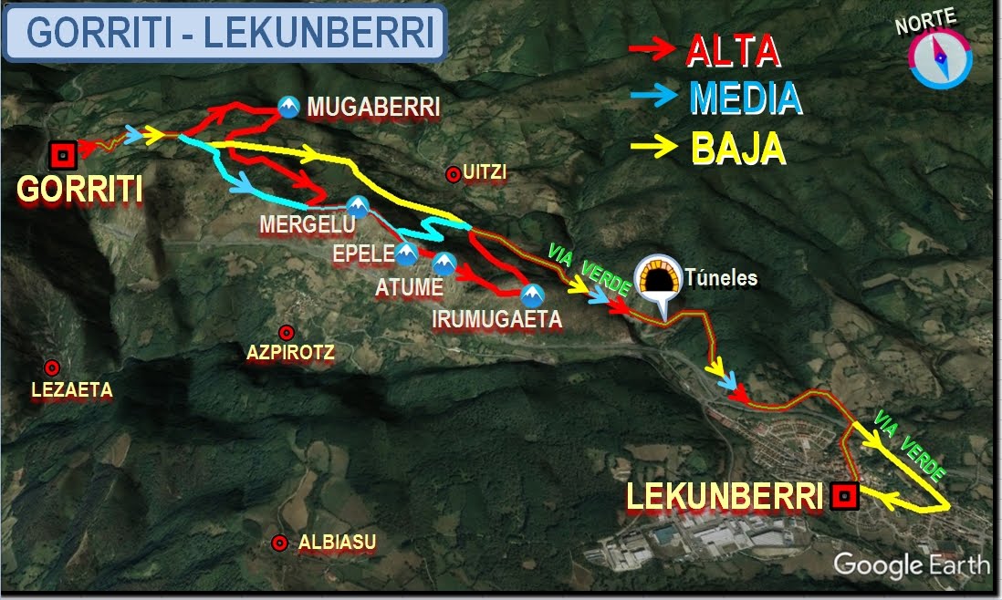 El grupo de BAJA saldrá de Gorriti siguiendo a los de MEDIA y ALTA por la carretera y procediendo a subir un tramo de cuesta fuerte. Así seguiremos hasta llegar a la carretera que cruzaremos para coger la pista del Plazaola, en la que hay tres túneles en los que no vendrá mal llevar linterna para pasarlos.