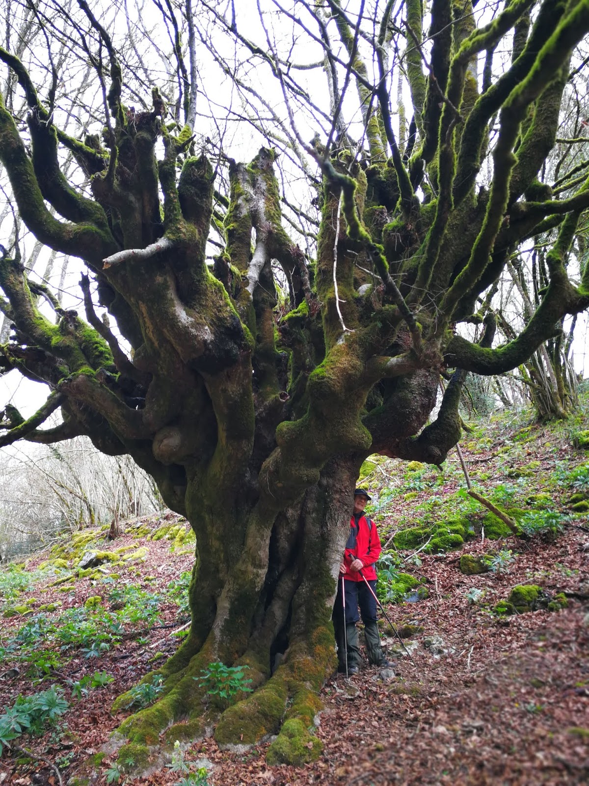 Por bosque de hayas y senda, poco definida, pasa por Ollarmendi, baja hasta un collado y desde aquí, por una senda bien marcada, asciende al Mergelu (912 m.).