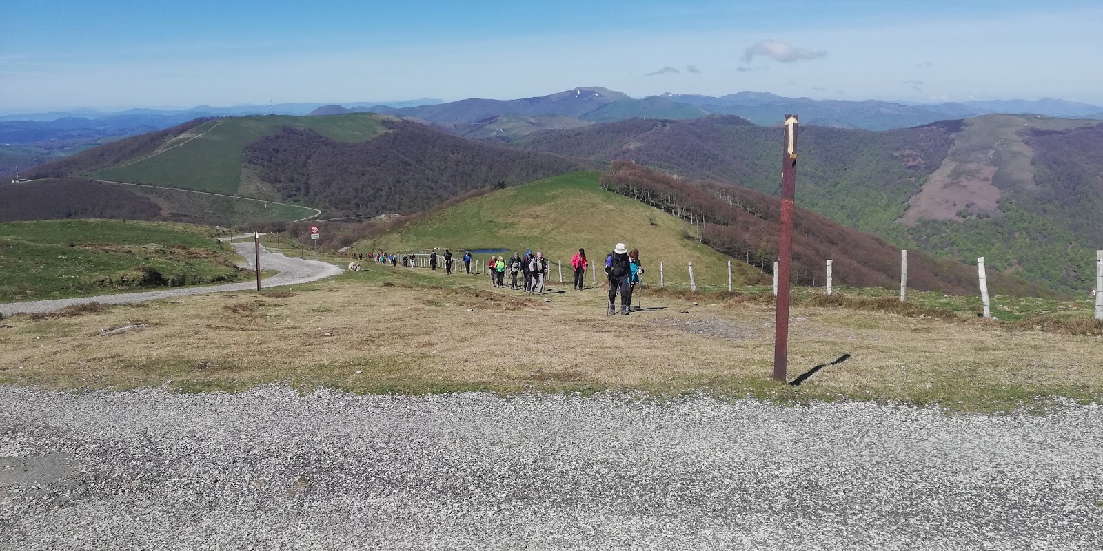 El grupo de MEDIA inicia el recorrido en el Alto de Ibañeta tomando el GR-12, subiendo hasta Lepoeder, unas veces cruzando la carretera NA-2033 y otras transitando por ella.