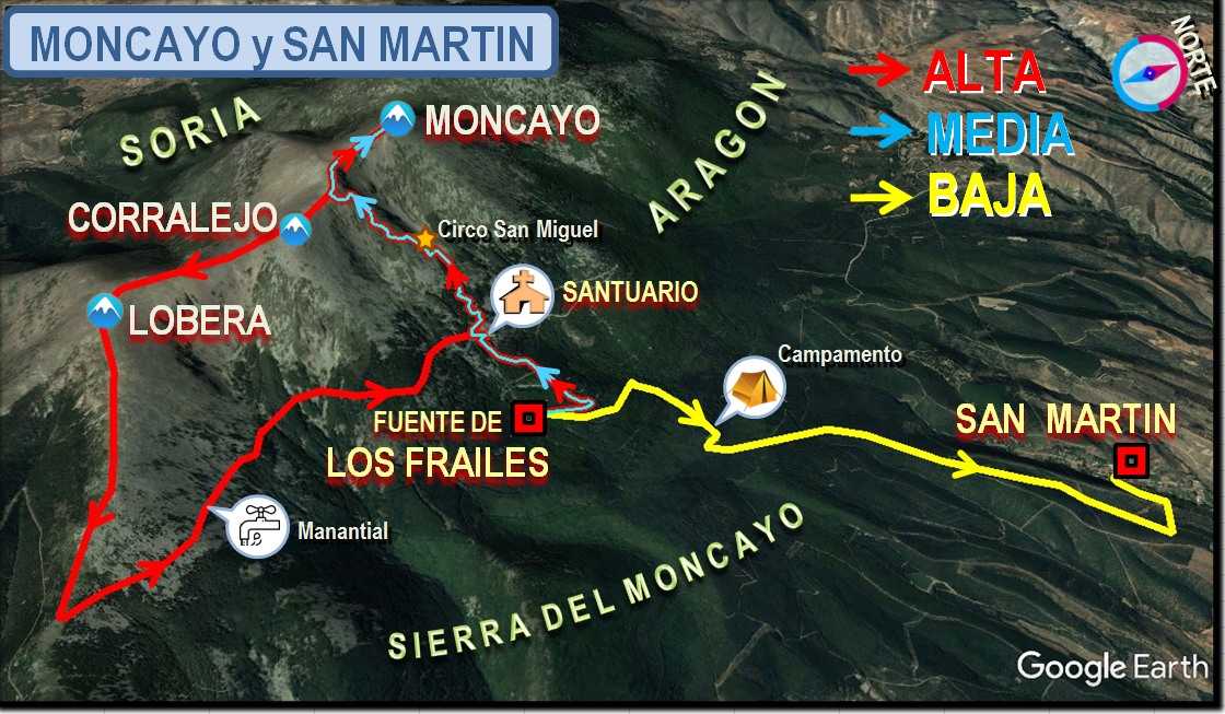 Por terreno pedregoso asciende hasta el collado, gira a la derecha para ascender a la cima del Moncayo (2.312 m.), desciende por el mismo camino hasta el collado, sigue por el cresterío, pasa por las cimas de Morca y de Lobera, continua de frente siguiendo los cairns o mojones, desciende hasta hacer un giro a la izquierda donde se incorpora a la GR-90 dirección al Monasterio.