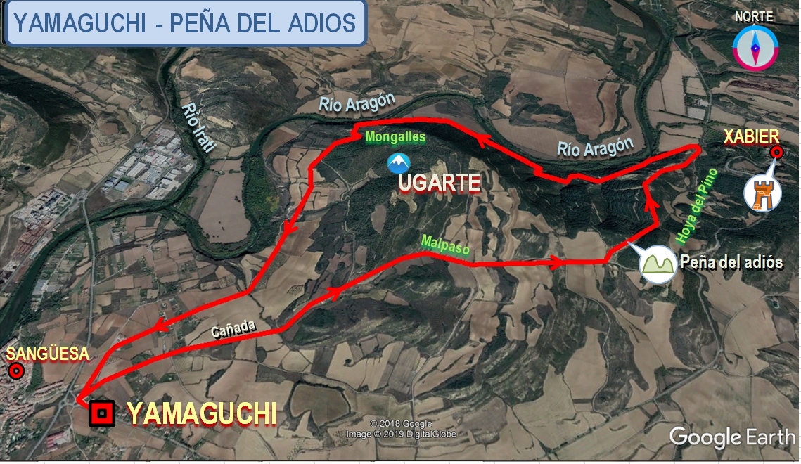 Sale por delante de hotel, gira a la derecha, toma la cañada de los Roncaleses, asciende hasta la peña del Adiós (donde San Francisco se despidió de sus tierras y castillo),