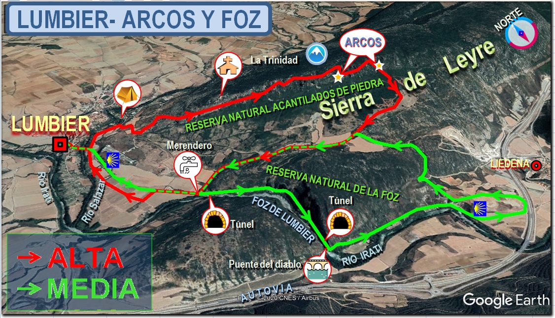 La MEDIA, inicia ruta con el grupo de Alta, cruzando el puente sobre el río Salazar donde nos separamos. Dirigiéndonos hacia la foz a la entrada del parque, pasando los viejos túneles del tren del Irati, a unos trescientos metros a la derecha podemos ir a ver las ruinas, del Puente del Diablo.