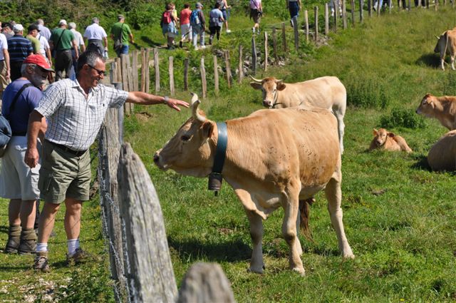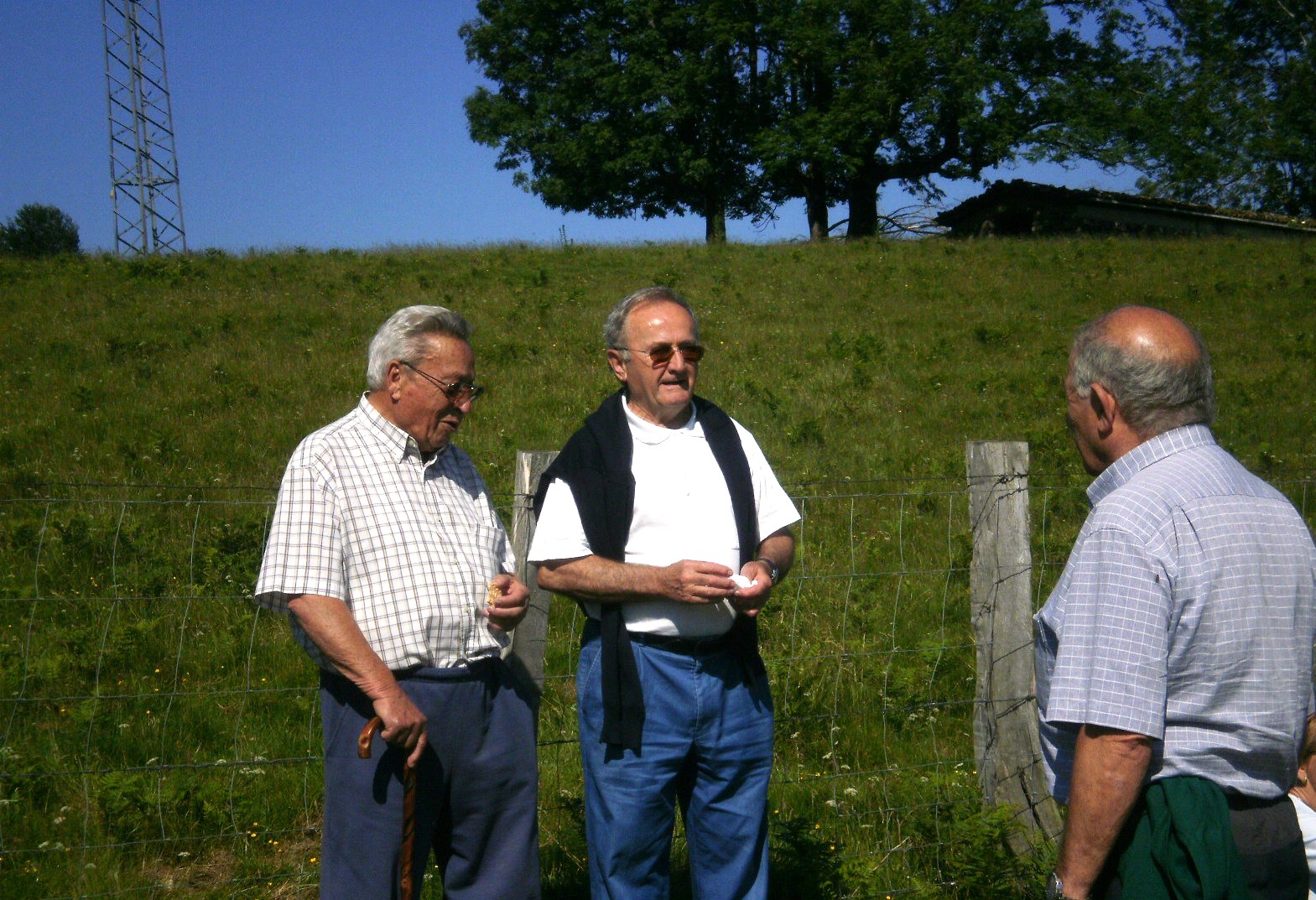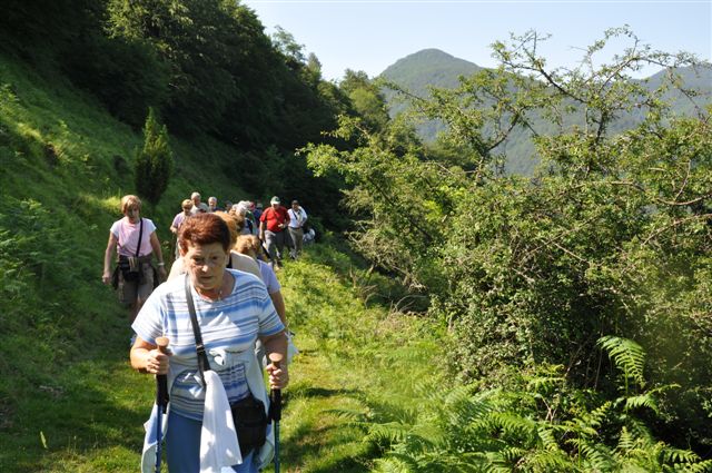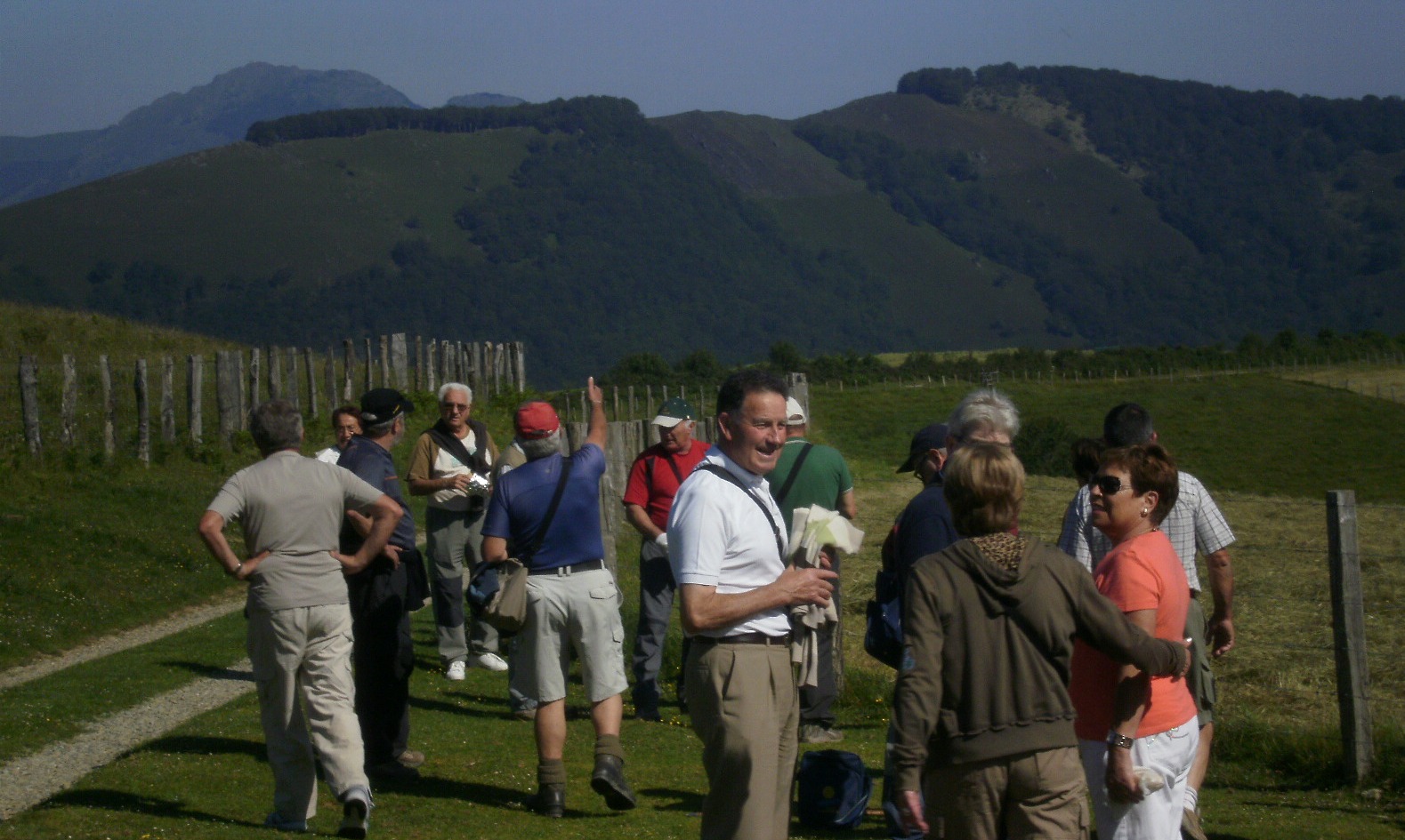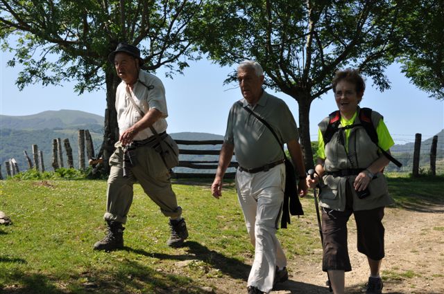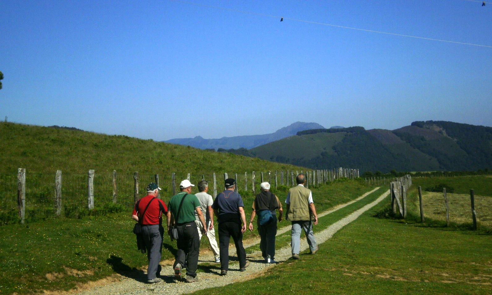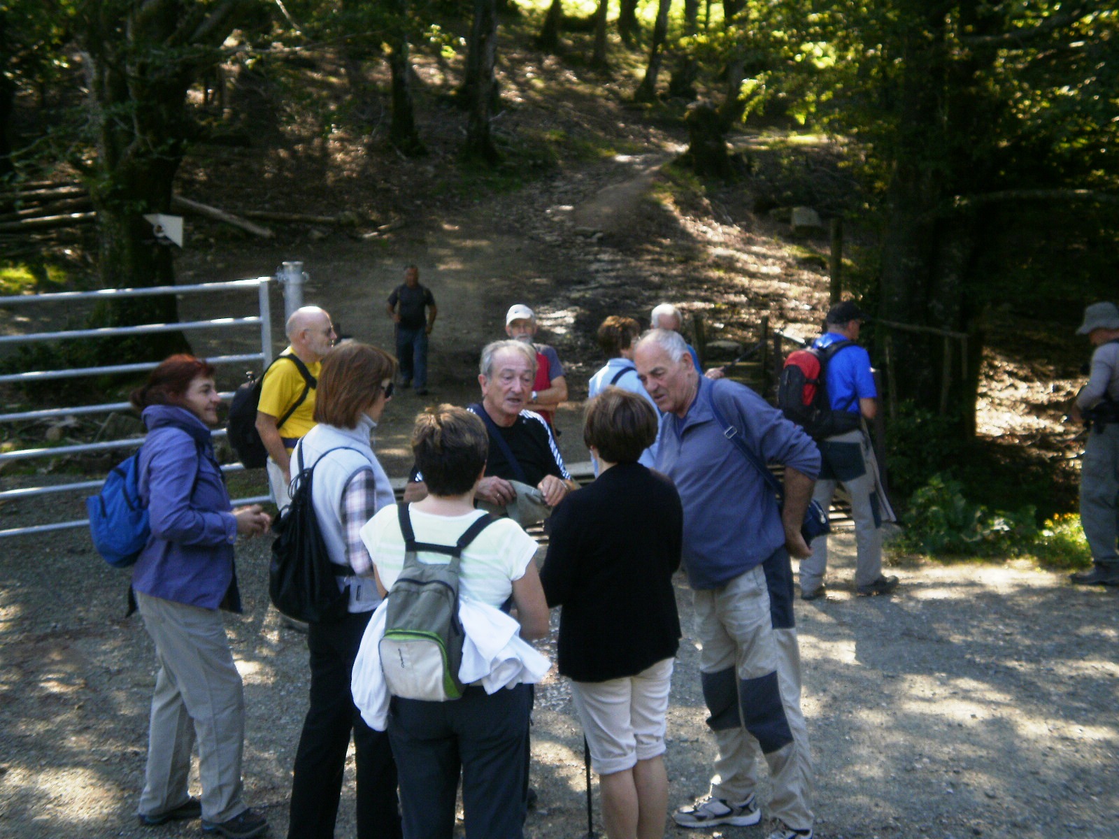 Los autobuses nos han llevado por la carretera antigua de Belate a las Ventas de Ulzama. En el Km. tres , se han bajado los de Montaña para hacer su ruta. Han tomado pista hacia el collado Ermitako Lepoa, y, por la calzada romana, al collado de Arluz para continuar por las marcas amarillas a Eskunzarreta, caserío Libus y Almándoz.