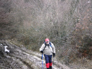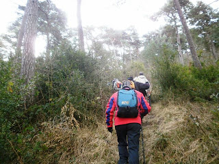 Nuestro grupo de Media hemos ascendido por el sendero que nos ha llevado por toda la ladera del Arromendi hasta alcanzar las palomeras. Es una subida larga que, a pesar del frío, nos ha hecho sudar. Estaba el suelo bastante helado. Si no es por ello, hubiéramos pisado bastante barro. El grupo se ha estirado y ha acabado partiéndose en dos antes del almuerzo. No ha habido mayores problemas salvo el que la senda de ascenso a Antxoriz estaba muy cerrada. Pero ha tenido sus alicientes pues nos ha obligado a ir en fila india Y así compartir mejor los incidentes. Poco a poco ha ido saliendo el sol y nos ha permitido gozar de buenas vistas, sobre todo, del valle de Esteríbar. También a veces del Collado de Egozcue. A ratos hemos ido entre cerrados y sombríos bojedales y luego por entre pinares con mejor senda .