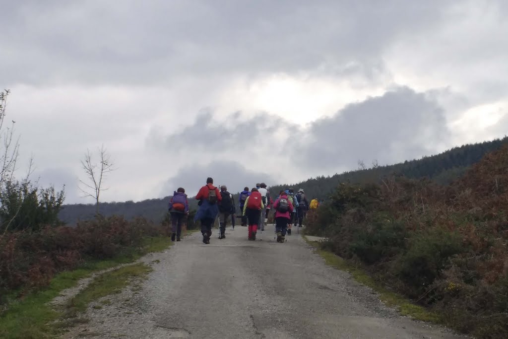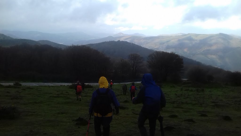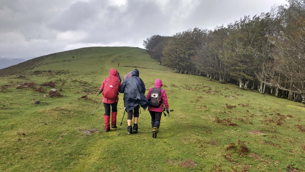 El grupo de ALTA sale del alto de Usateguieta por una pista que la seguiremos durante cuatro kilómetros para coger un camino por el lado derecho y después una senda no muy definida.