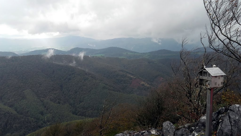 Pasaremos una alambrada continuando paralela a ella hasta el Zuparrobi. La bajada del Zuparrobi la hacemos en diagonal, por pradera, hasta enlazar con la pista de los molinos que viene de Leitza. Subimos al Kornieta y regresamos, de nuevo, a la pista para abandonarla en una curva cogiendo una senda por pradera, a la derecha, para pasar al lado de una sima.