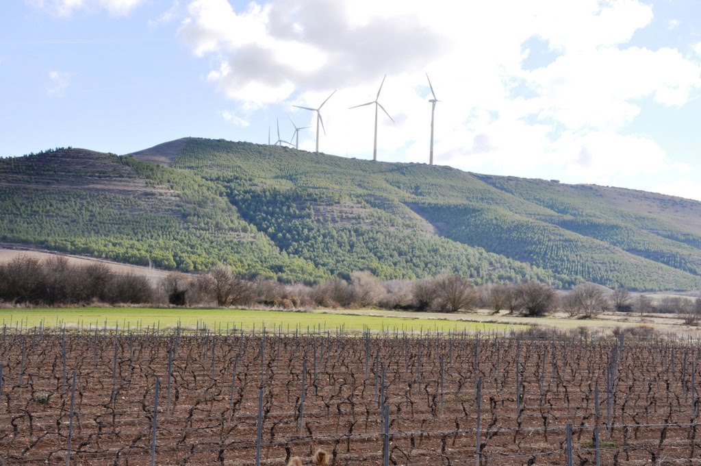 Por entre los viñedos de las bodegas de Inurrieta. Se ven al fondo
