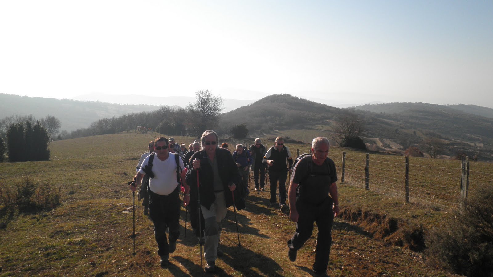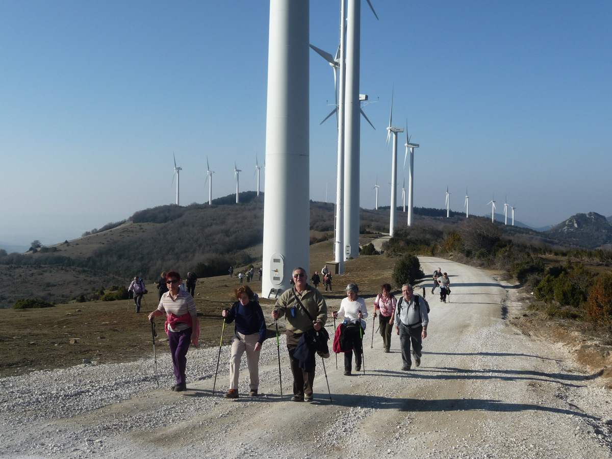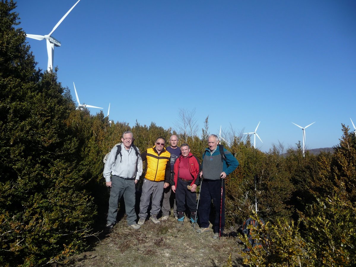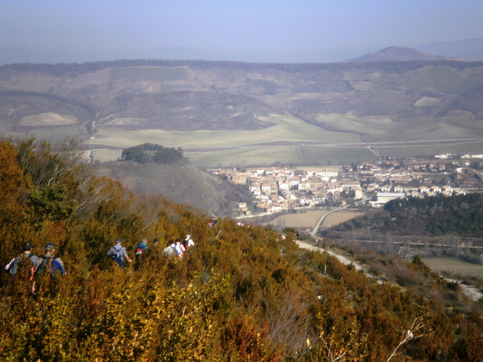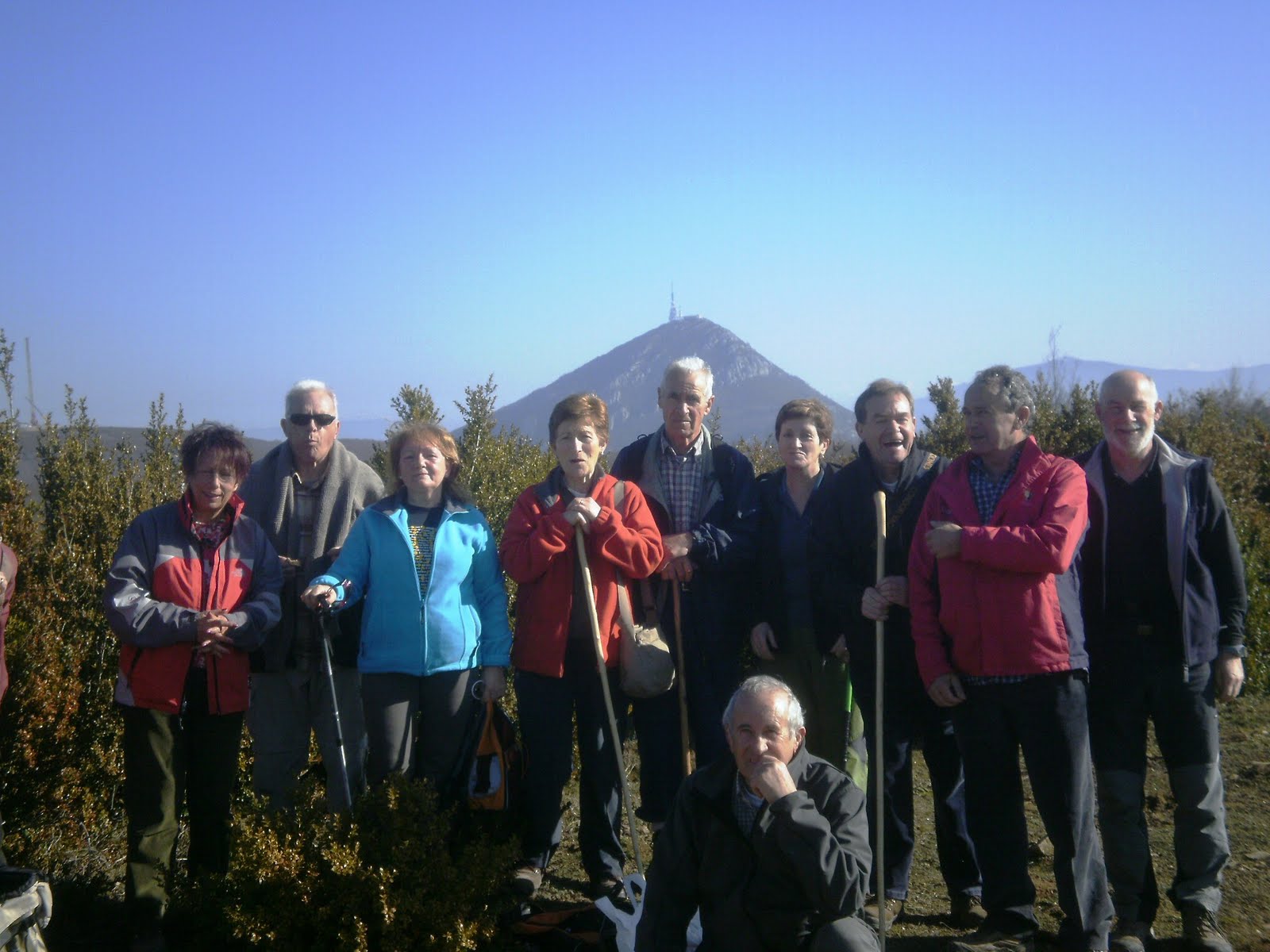 El grupo de MONTAÑA, desde Etxagüe, se ha encaminado hacia la derecha para alcanzar la cima y por las crestas, pasando los eólicos y por una senda, tomar el camino que por la izquierda de la Higa les ha llevado hasta Monreal.