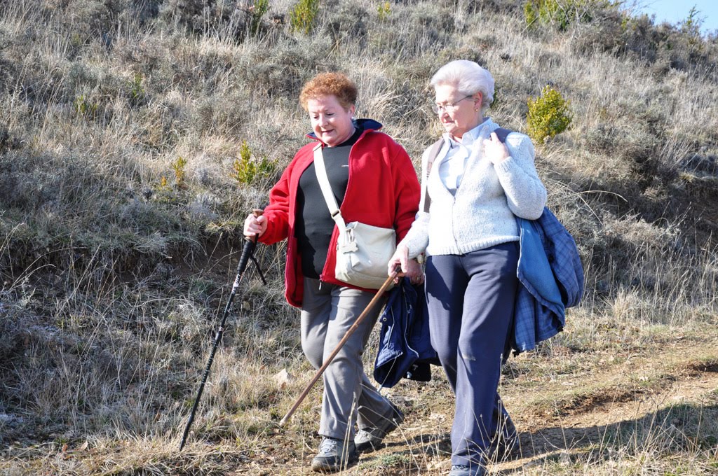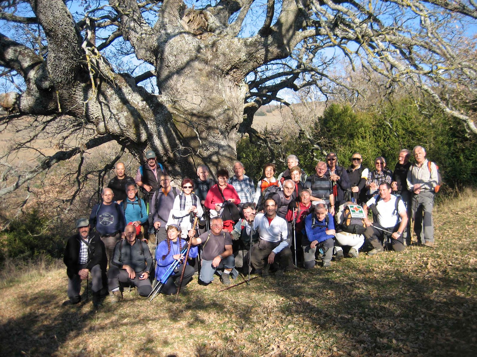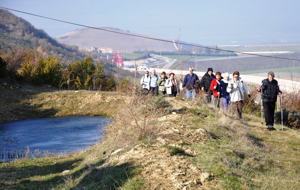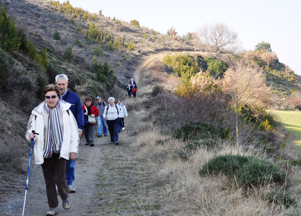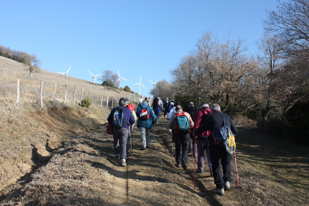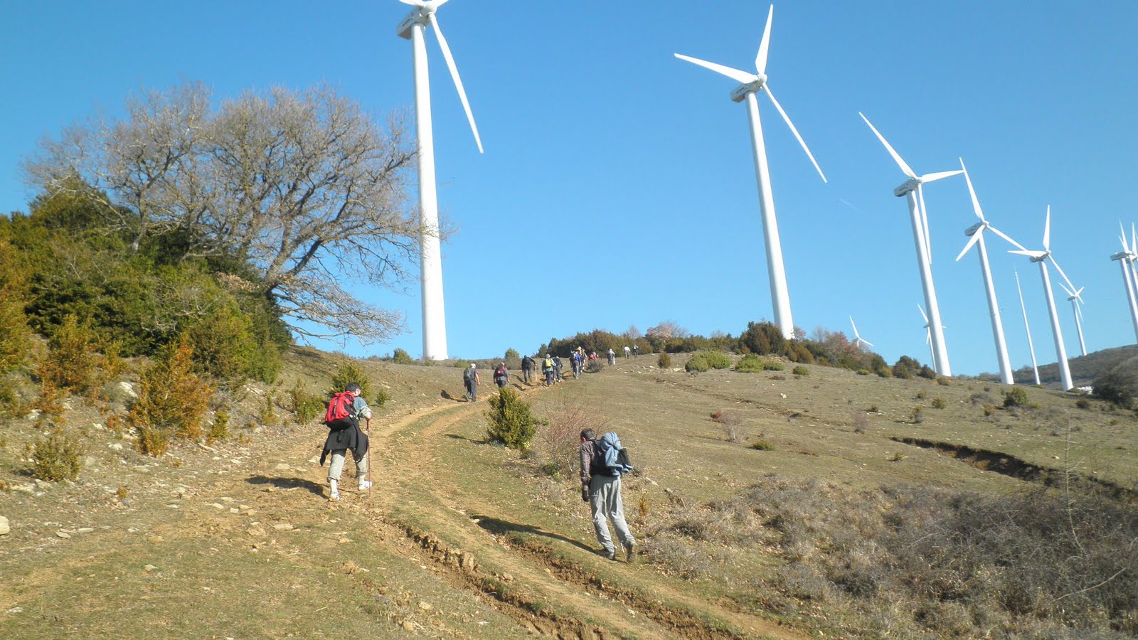 El grupo de MONTAÑA, desde Etxagüe, se ha encaminado hacia la derecha para alcanzar la cima y por las crestas, pasando los eólicos y por una senda, tomar el camino que por la izquierda de la Higa les ha llevado hasta Monreal.