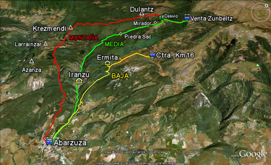 El grupo de MONTAÑA, después de separarse del grupo de MEDIA y por el PR-181, llega a Dulantz. Siguiendo por donde se puede circular con coche todo terreno continuará hasta encontrar el camino que baja de Krezmendi, asciende y baja hasta entrar entra en Abárzuza.
