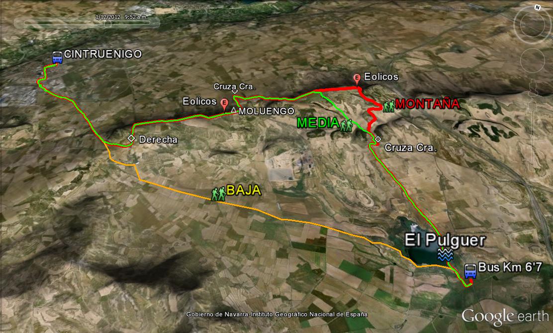El grupo de MEDIA al llegar a la balsa del Pulguer la bordean por la parte derecha y por pista se dirigen a los montes del Cierzo. Cruzan la Carretera NA-160 con mucho cuidado pues el tráfico es rápido y denso. Toman la pista que sube hacia el centro de los eólicos de las Clavijas y continúan junto a los molinos. Descienden a la carretera por una pista, la vuelven a cruzar con cuidado. Ascienden al siguiente grupo de molinos del Molengo y continúan por su cresta. Luego bajan por una pista hacia Cintruénigo.