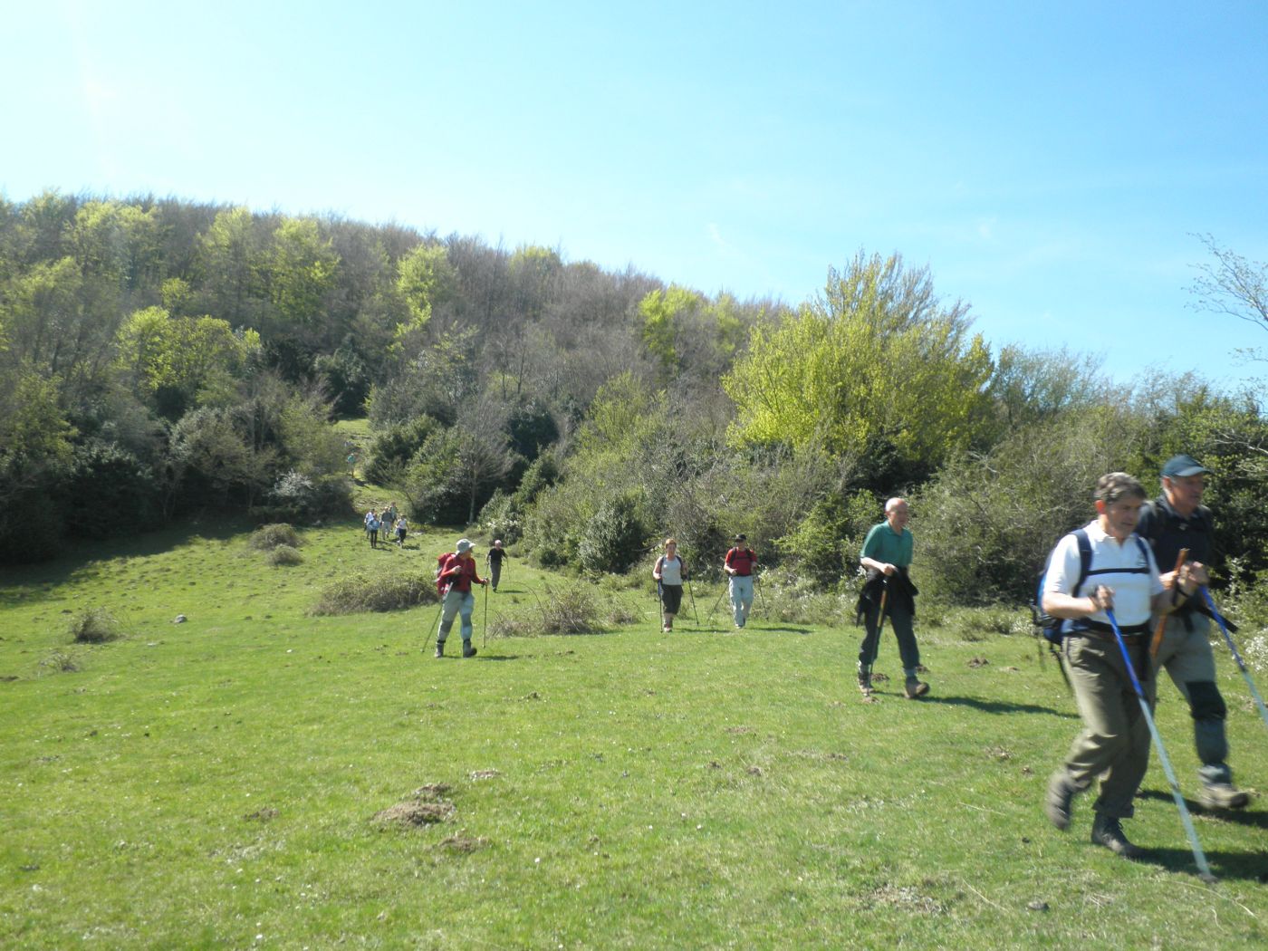 Los de Baja descienden en Esnotz toman la pista hacia Lusarreta, ascienden al collado donde tras cruzar un paso canadiense dejan la pista para tomar a la izquierda una pista-senda que les lleva hasta la carretera vieja del Camping.