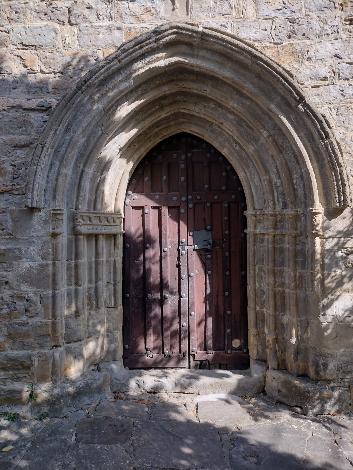 de la puerta de medio punto con crismón en una de las arquivoltas. Se trata de