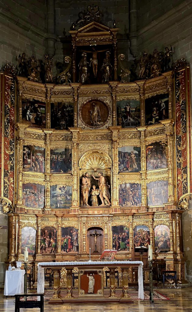 El retablo mayor, plateresco de 1530, tiene esculturas del Bautista, y sobre todo pinturas, de las cuales, las más bajas son de Pedro Aponte, muy buenas. Tiene además el retablo de la Virgen de la Paz, patrona de la localidad, gótica del XIV, y otros retablos interesantes como La Epifanía, El Crucificado,…