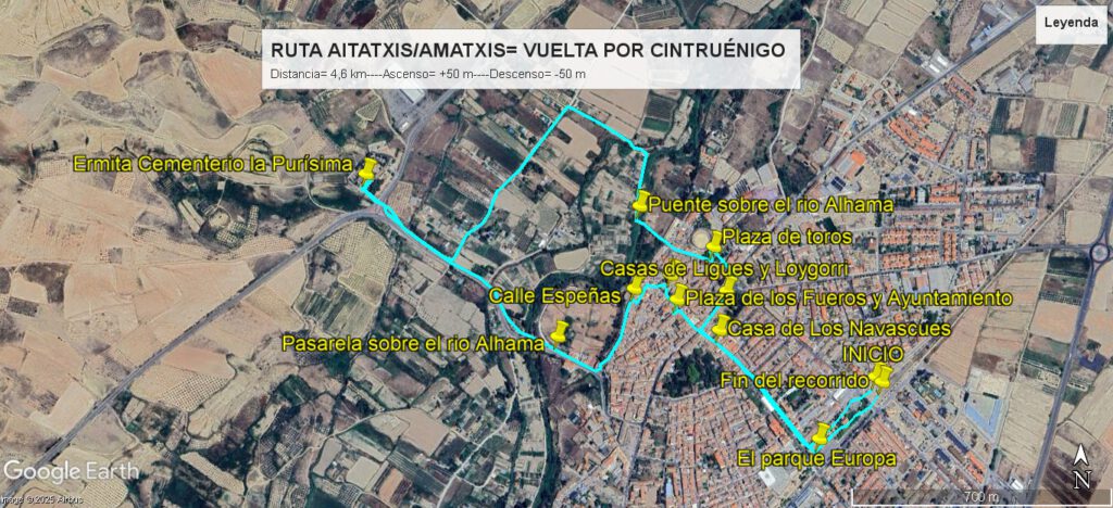 Comenzamos el recorrido junto a la estación de autobuses de Cintruénigo, para continuar por el parque Europa, a continuación giraremos a la derecha para tomar la avenida de Pablo Rubio, y calle José María Ligues, donde se encuentra la casa de los Navascués y por la calle Rúa llegar a la plaza de Los Fueros, donde se sitúa el Ayuntamiento, poco más adelante se encuentra la Iglesia dedicada a San Juan Bautista. Proseguiremos por la calle San Juan, para salir a la llamada Espeñas y seguido a la carretera de Fitero. Cruzaremos el rio Alhama por una pasarela, y más adelante llegar a cruzar la carretera Fitero- Corella, por paso de cebra con mucho cuidado, y acercarnos a laermita de La Purísima.