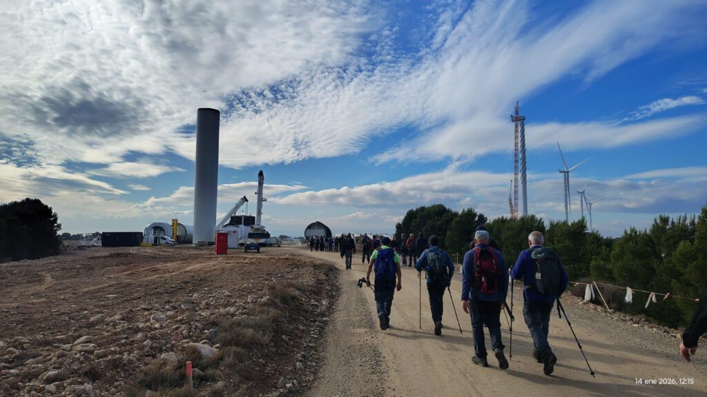 Continuaos por camino y algunos tramos por sembrados que serán inevitables y así hasta llegar a una pista recién hecha para subir al parque eólico Montes de Cierzo, pero nosotros subiremos por un pequeño pinar, cruzaremos todo el parque y al final descenderemos hasta la llanura para más adelante por una suave subida llegar al segundo parque, también lo cruzamos, pero en este veremos molinos en pie, otros a medio montar y las largas aspas apiladas en el suelo. De nuevo al final bajaremos a la gran llanura y por pista cruzando sembrados, viñedos y olivos llegaremos a Cintruénigo. Tras cruzar varias carreteras, con mucho cuidado por su cantidad de tráfico, atravesamos casi todo el pueblo hasta llegar al parking de la estación de autobuses donde nos esperan nuestros autobuses.