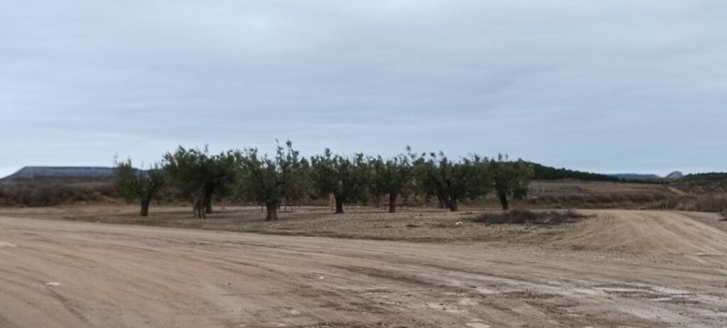 La ruta se inicia en el km 8 de la carretera de Ejea, en una entrada del Parque Natural, seguimos el camino de las Bardenas Reales o "del Monte", pronto lo dejamos para seguir otro que encontramos a la derecha, que igualmente dejaremos y, por senda, subir al monte Olivete (490 m), el acceso no está muy claro, en lacima tenemos buenas vistas. Volvemos por nuestros pasos un pequeño tramo y bajamos por la derecha hasta una balsa y aquí de nuevo tomamos el camino de las Bardenas Reales, más adelante, en otra balsa junto a una borda, giramos a la izquierda, pasamos unas colmenas y tenemos otro tramo poco claro, subimos hasta un campo de cultivo que bordeamos, para bajar a otro camino, de frente, los molinos eólicos, subimos hasta la subestación parque eólico la Bandera, 462 m. Un buen sitio para almorzar con vistas