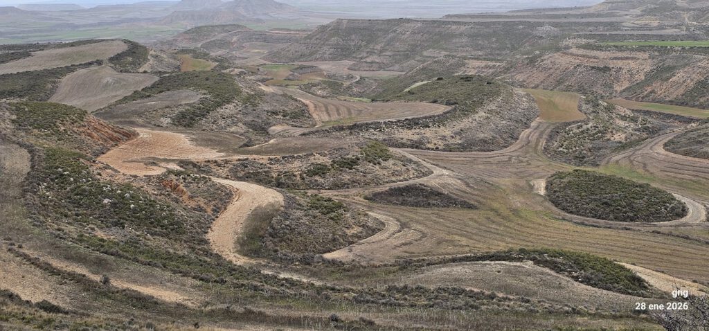 Desde aquí cruzaremos tres filas de geodésicos dondeiniciaremos la bajada hacia un barranco con bastante pendiente, por lo que se recomienda hacerlo con cuidado y más si ha llovido. Una vez abajo seguimos sin dejar la pista que nos conducirá hasta el aparcamiento de los autobuses en Fustiñana, final de nuestraexcursión.