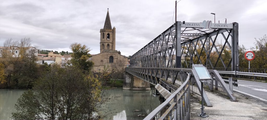 A Continuación giraremos a la izquierda para seguir por la acera del puente sobre el Rio Aragón, y después continuar por el arcén con mucho cuidado, hasta una rotonda, donde giraremos 180º a la