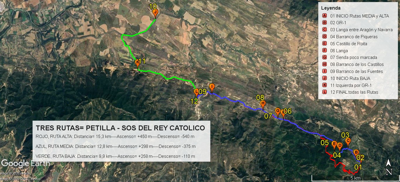 Inicio de la ruta en el km 7 de la carretera de Petilla, pronto dejamos esta carretera por una senda que nos llevará hasta la pista de la GR-1, salimos de la pista para seguir la senda hacia Sos del Rey Católico. Al pasar una langa llegamos a Cinco Villas, muga entre Aragón y Navarra, cruzamos el barranco de Piqueras, lleva agua, pero lo hacemos fácil. Seguimos la indicación hacia Sos, por bonita senda junto al barranco de los Castillos, llegamos a un corral en ruinas, buen sitio para almorzar. Después de cruzar otra langa dejamos el camino y entramos en una senda poco definida, en un punto, el agua del barranco Los Castillos impide el paso, por lo que lo bordeamos.